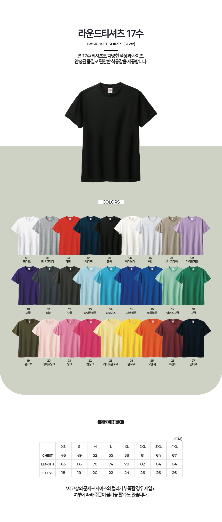 면 17수 티셔츠로 다양한 색상과 사이즈, 안정된 품질로 편안한 착용감을 제공합니다.