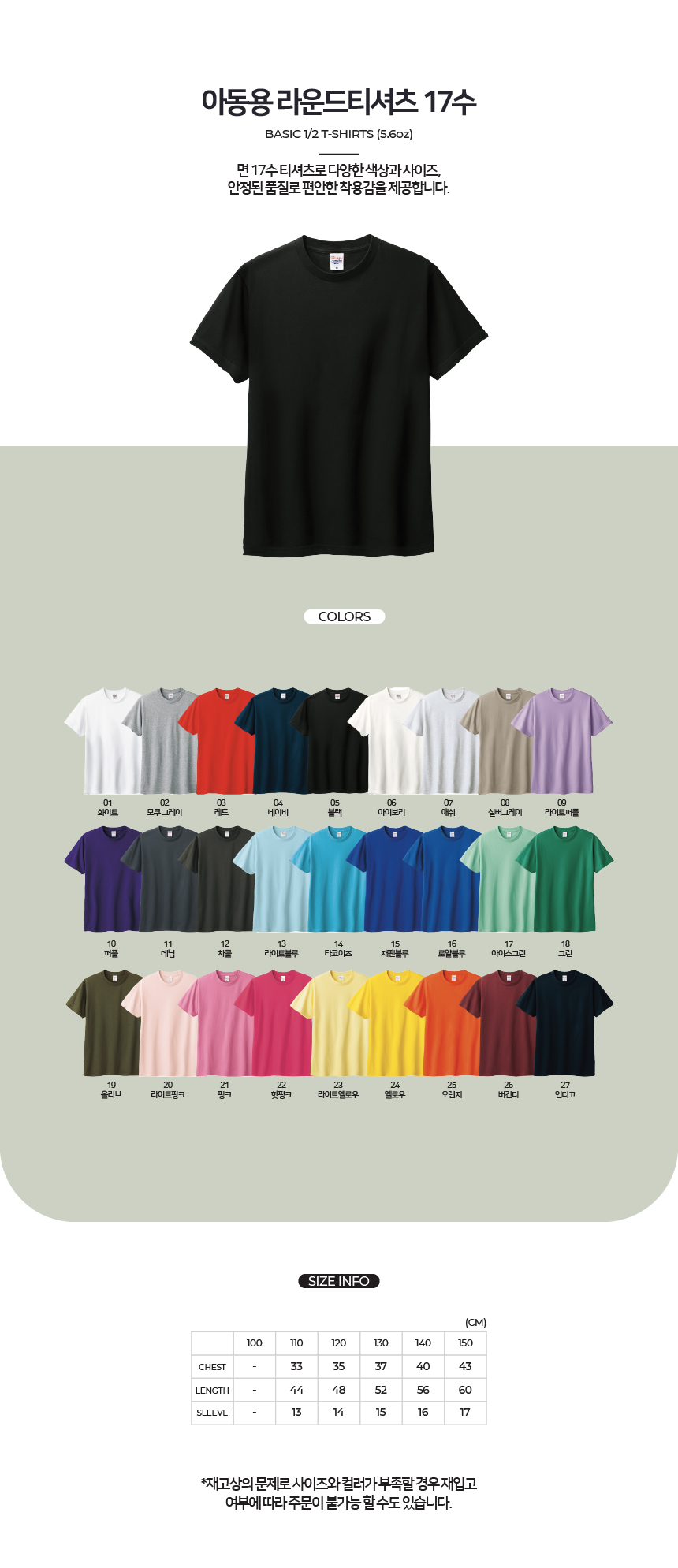 면 17수 티셔츠로 다양한 색상과 사이즈, 안정된 품질로 편안한 착용감을 제공합니다.