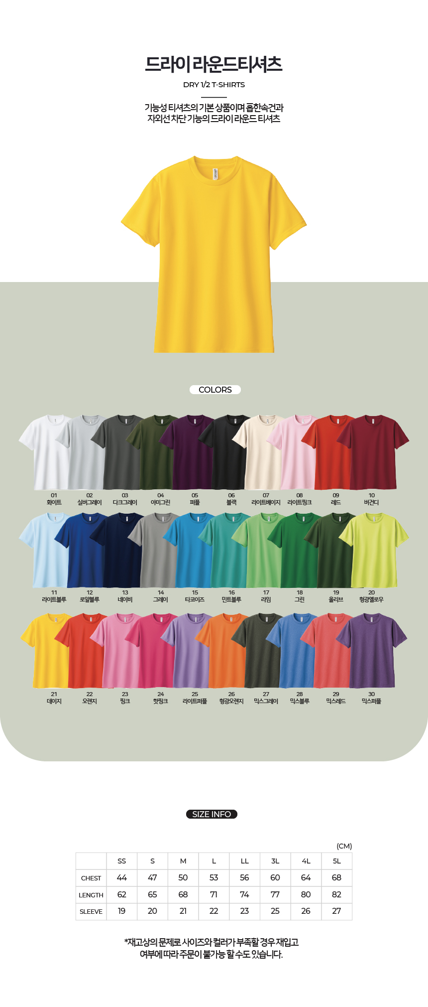 기능성 티셔츠의 기본 상품이며 흡한속건과 자외선 차단 기능의 드라이 라운드 티셔츠